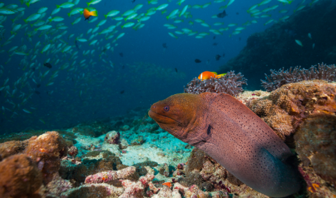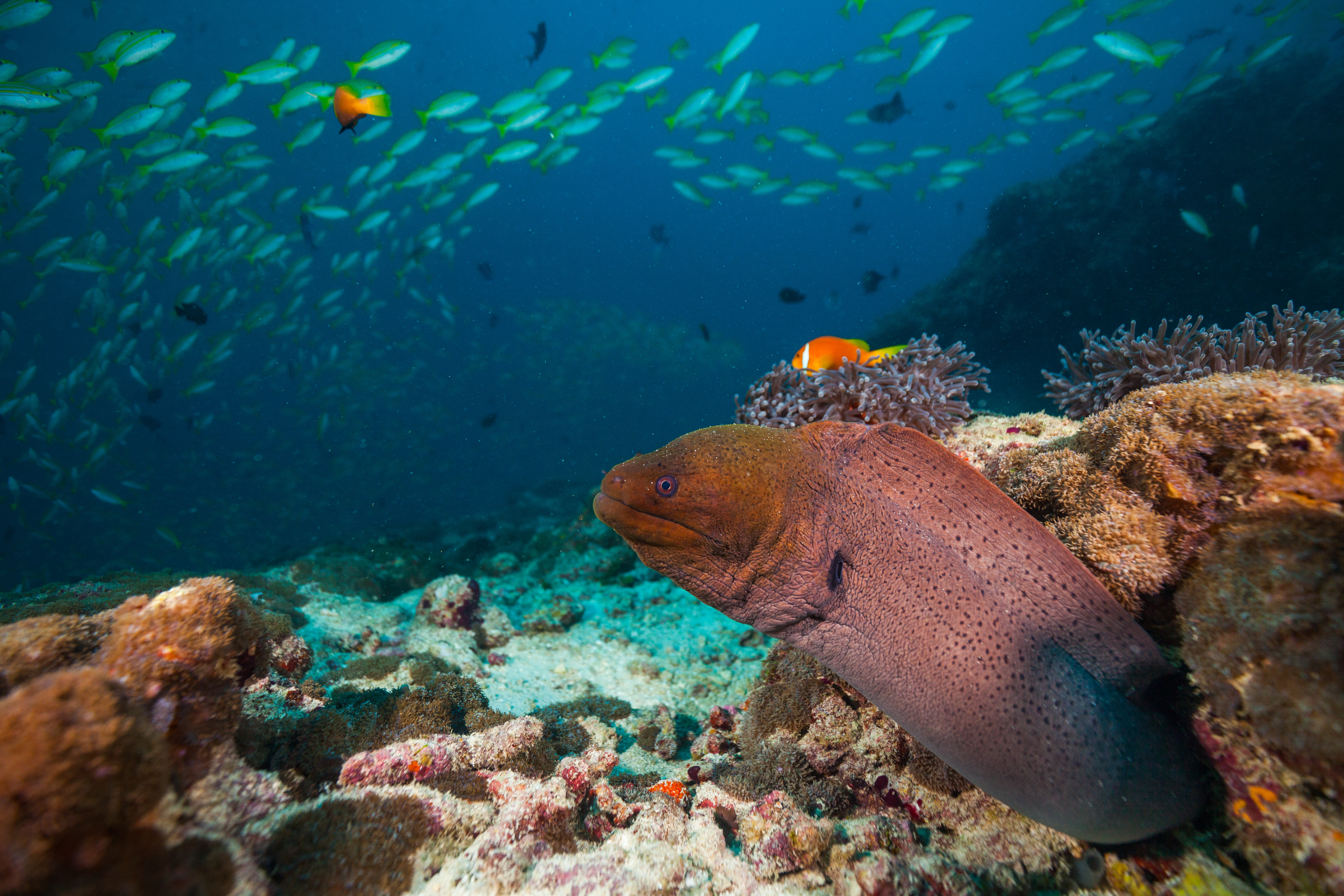 Guraidhoo Corner is known for its fantastic underwater landscape. There are walls dropping down for 30m with healthy reefs and channels full of colorful reef corals. Some underwater turbulence often takes place at this dive site. The most frequent large species at Guraidhoo Corner are eagle rays and gray reef sharks. Other interesting species include moray eels, squirrelfish, parrotfish, and grouper that often show themselves.
