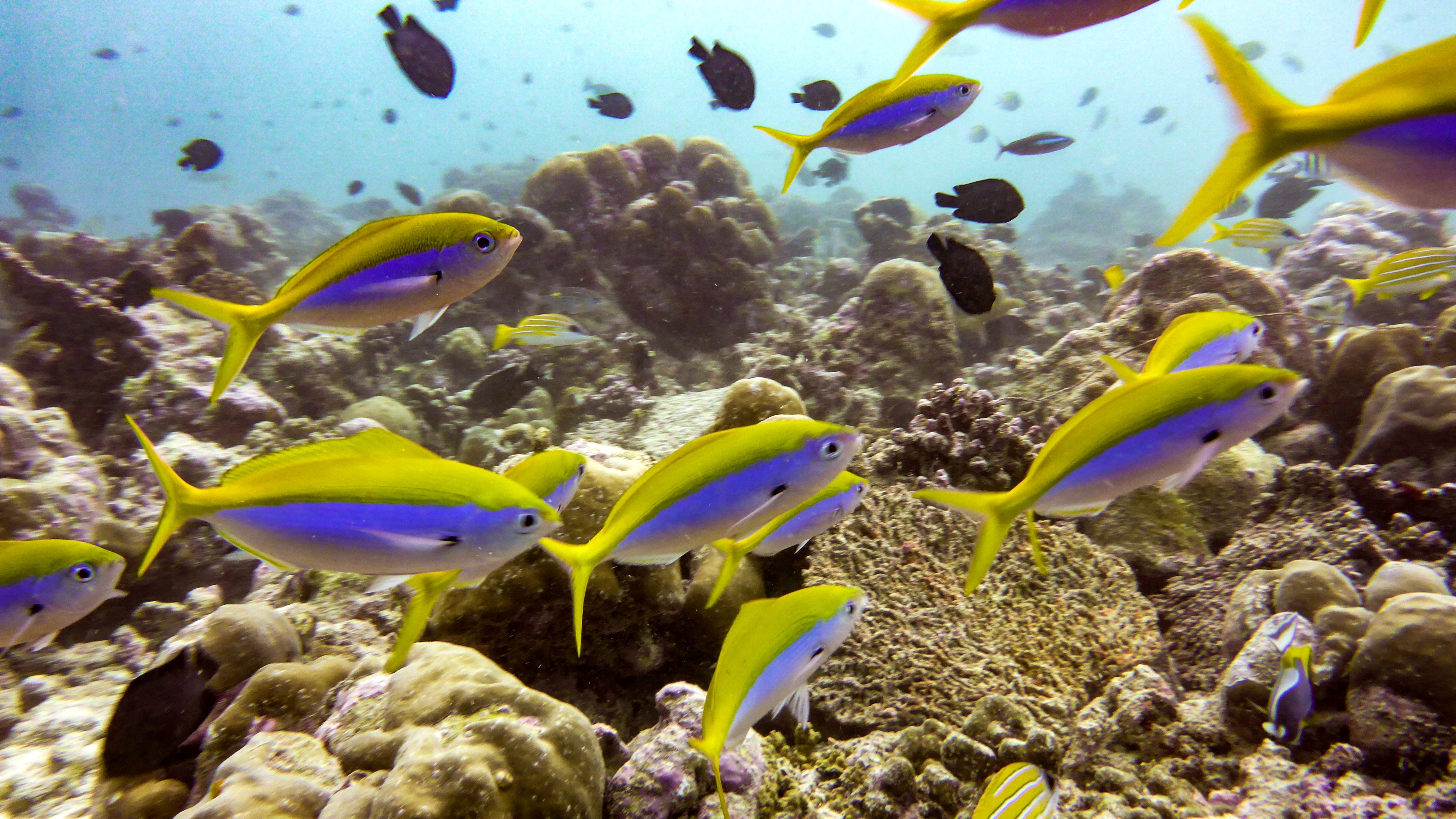 Miyaru Kandu is an awesome channel dive in the Maldives that represents many small caves on both sides of the channel and several overhangs. The entire channel has been declared a protected marine area. The south side passage of the site contains many large rocks covered with soft corals and abundant reef fish. On the north side of the channel, there is a cave 33m/108ft deep, which is ideal for spotting grey reef sharks. There are also many caves and overhangs at deeper depths on the outside of the reef. This location is ideal for underwater photography. It is a site to observe big pelagic fish as well as colorful corals including a lot of soft and hard corals to be explored. Big pelagic fish like sharks, eagle rays, tuna, and Napoleon wrasse can be found here, as well as many colorful reef fish. Whitetip and black-tip reef sharks are often seen in the channel, while grey reef sharks, hammerhead sharks, and the occasional tiger shark can be seen on the outer side of the reef.