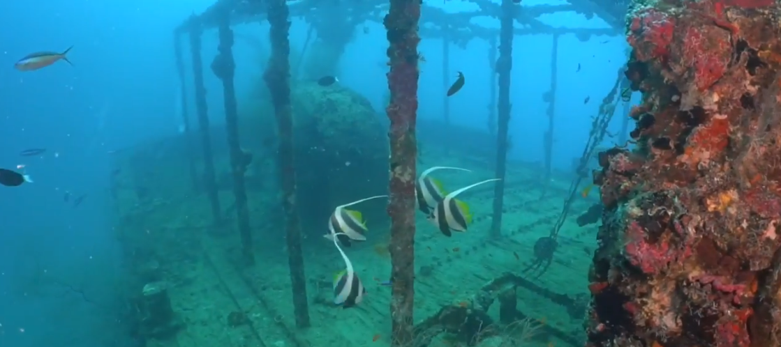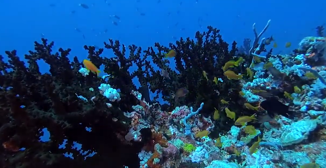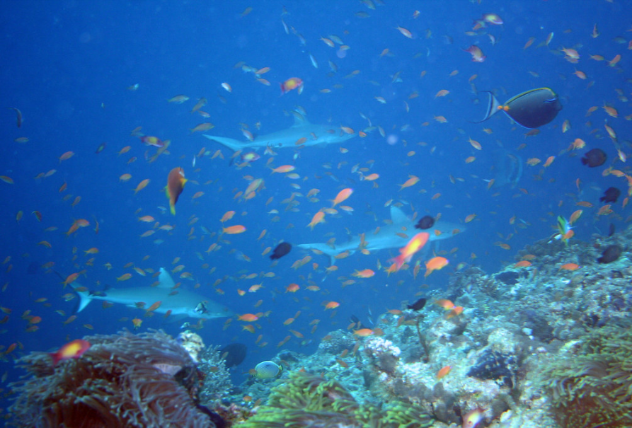 A very wide dive site. The top of the reef is 10m deep. The southern side of the reef drop down to +40m. The SE corner is known as The Fish Head. Fish Head is a very famous dive site in the Maldives. This site is protected by the Maldivian government. The sides of the plate consist of steep walls descending to 35 meter. Here you' ll find large and small overhangs and numerous caves. Marine life thrives at Fish Head. You'll spot grey and white reef sharks, schools of fusiliers, mackerel and tuna, turtles, snappers, and surgeonfish.